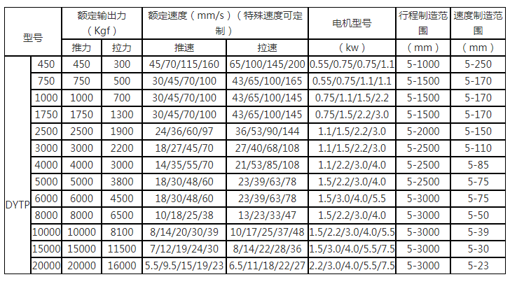2、表中的電機型號及功率,指該推桿在額定輸出力、額定速度時為最大值的功率,電機功率與推拉力成正比。