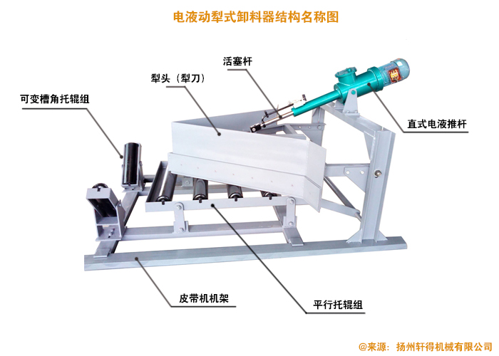 犁式卸料器主要結(jié)構(gòu)有:電液推桿、犁頭(犁刀)、可變槽角托輥組、平行托輥組、皮帶機(jī)機(jī)架等。