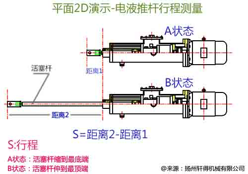在測量電液推桿前,首先將電液推桿通電,將活塞桿進行空載往復運動,觀察活塞桿是否伸縮到位,否則就測量不出活塞桿的最大行程,下面我們通過平面2D圖片演示,大家就能一目了然。