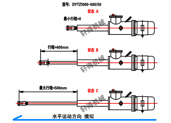首先給大家舉個例子,電液推桿型號為:DYTZ1000-500/50,相信大家看到這個型號就會了解這是什么樣的電液推桿,大概的參數(shù)是什么,如果有不了解的,請點擊文章最下方的相關(guān)文章進行了解,大家請先看下面的模擬圖:
